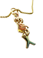 Repurposed charm is gold with clear stone detail. Charm length is 2”. Gold plated chain is 16” long.