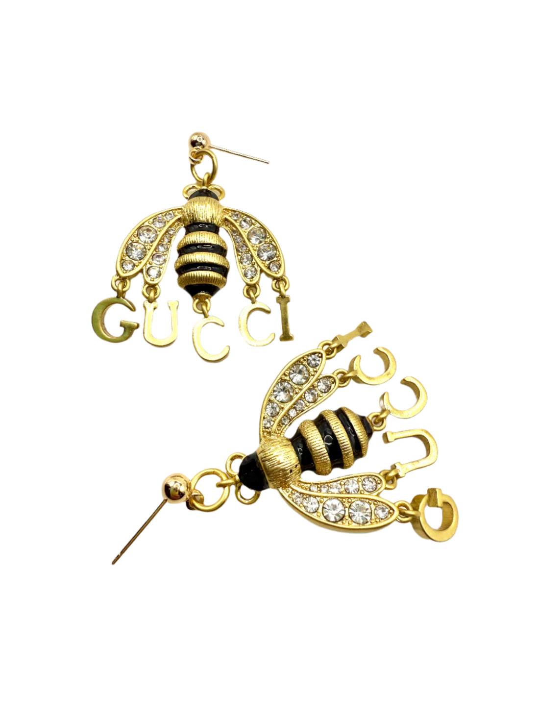 Repurposed charm is black and gold with stone detail. Charm is 1” long and total earring length is 1.5”.