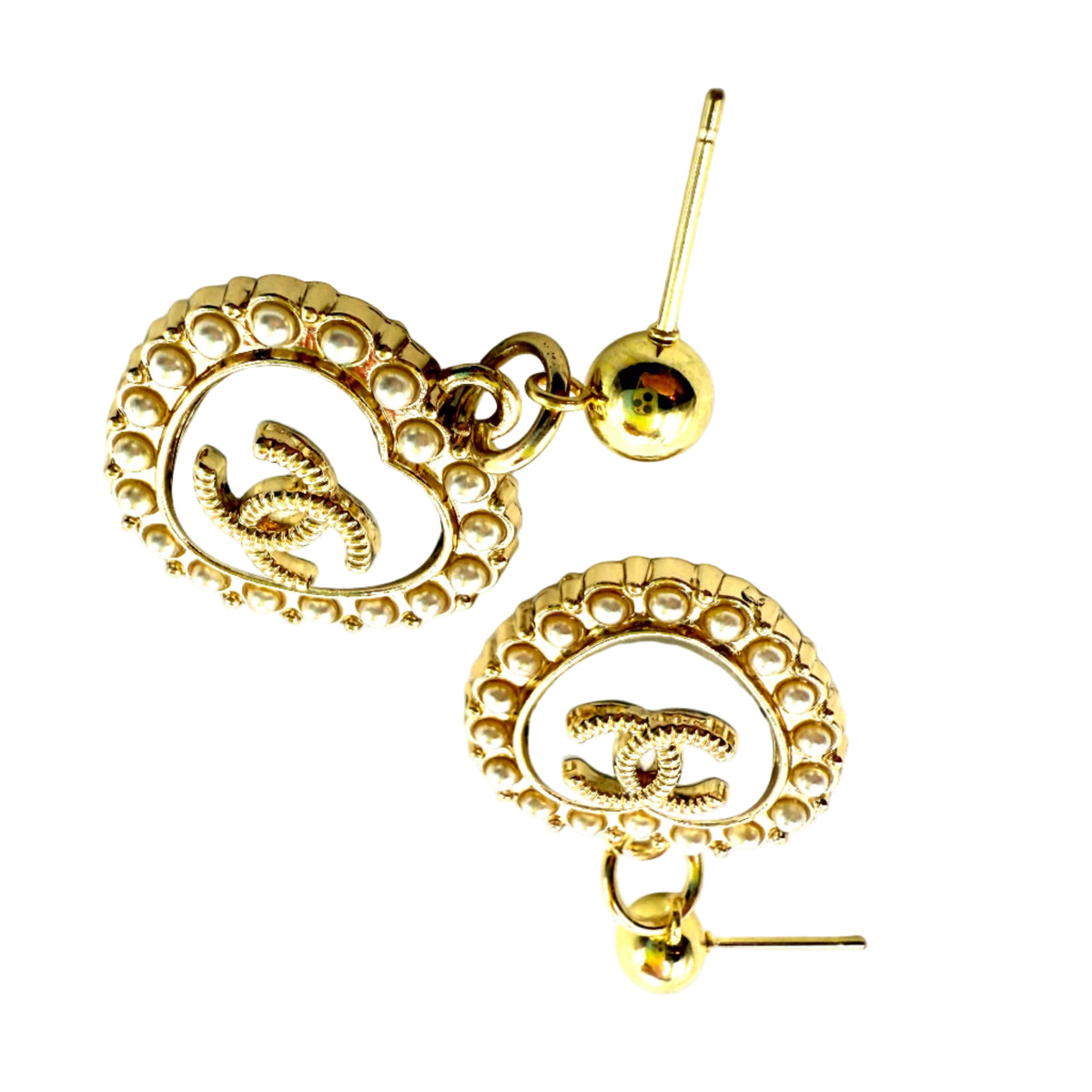 Repurposed charms are white with gold and faux pearl detail. Charm length is .75” and total earring length is 1.5”.