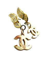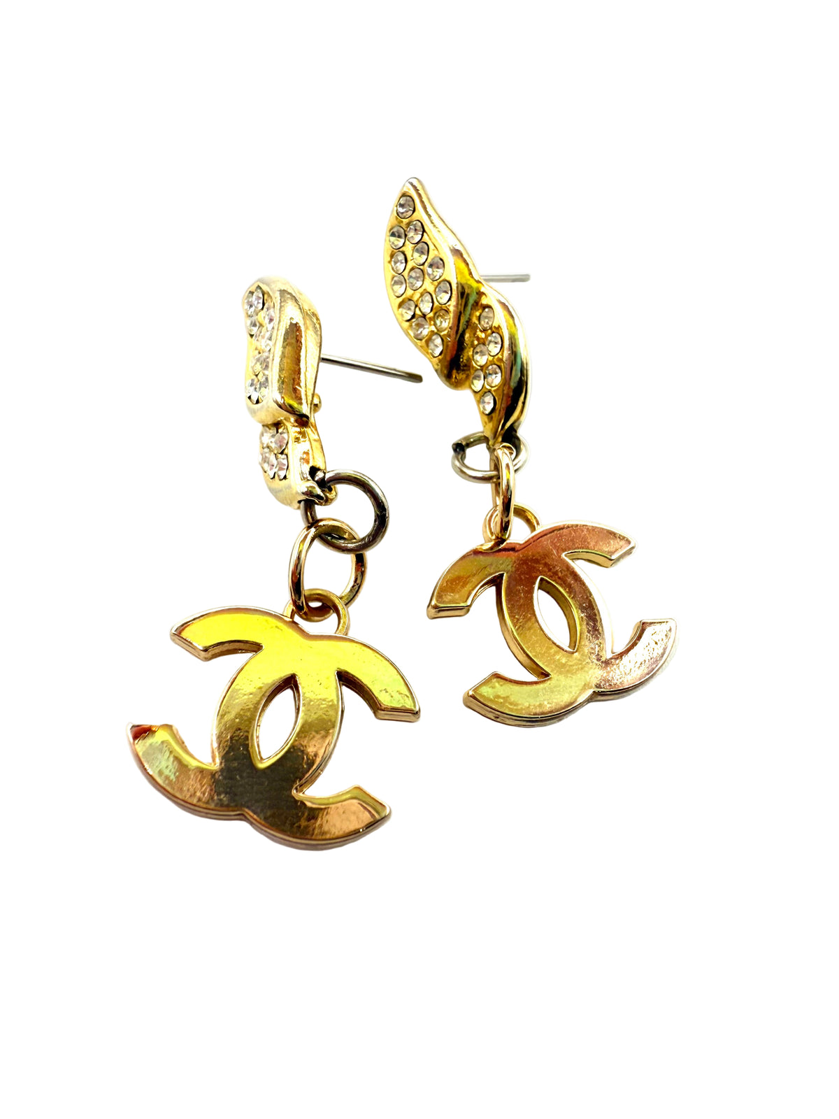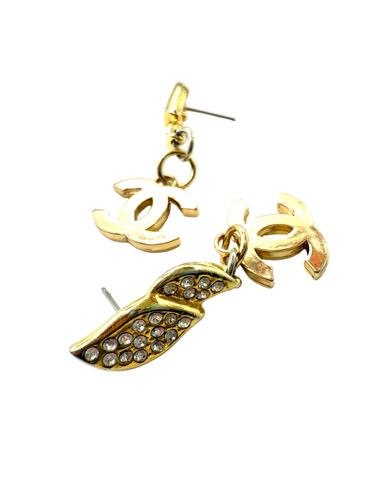 Earrings constructed from reworked vintage costume jewelry and repurposed charms. Earrings are gold with clear stone detail. Total earring length is 1.8” long.