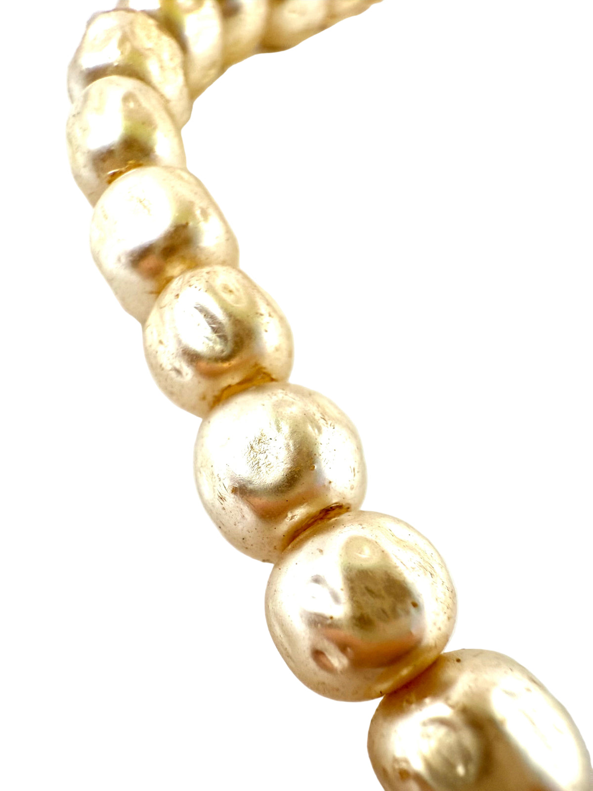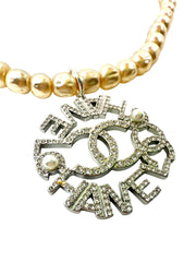 Necklace constructed from 17” faux pearl vintage costume jewelry necklace and repurposed charm. Charm is silver with stone and faux pearl detail. Charm width is 1.75”.