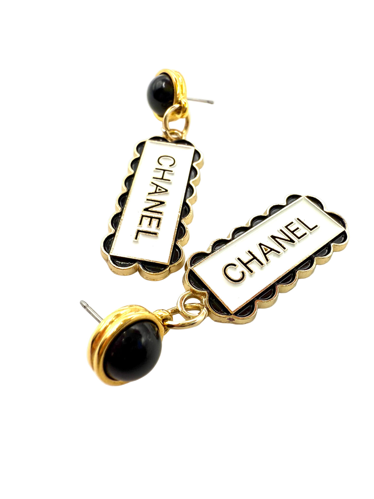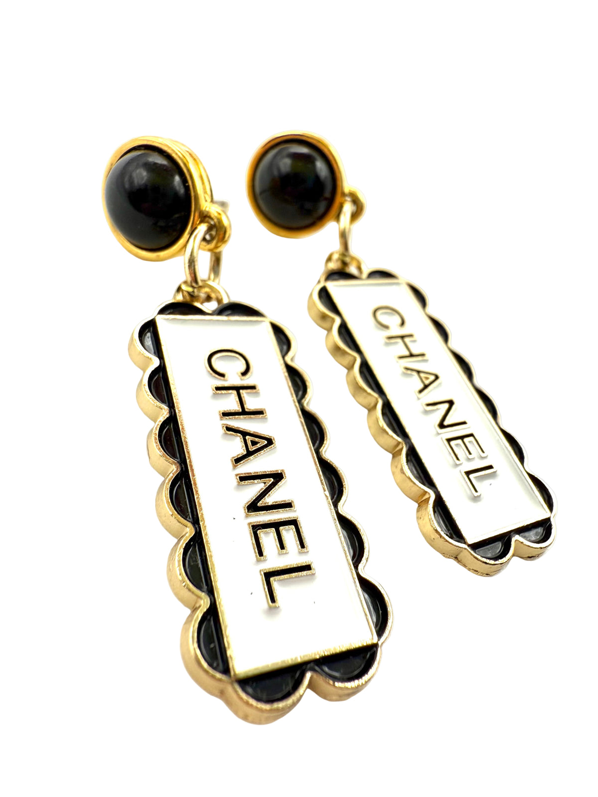 Earrings constructed from reconstructed vintage costume jewelry earrings and repurposed charms. Earrings are black and white with gold trim. Total earring length is 1.8”.