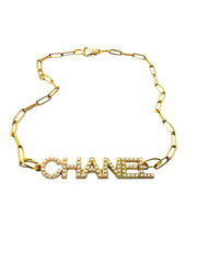 Gold plated paperclip chain with repurposed charm. Charm is gold with faux pearl detail. Charm is 2.25” long and .5” wide. Total necklace length is 15.5”.