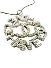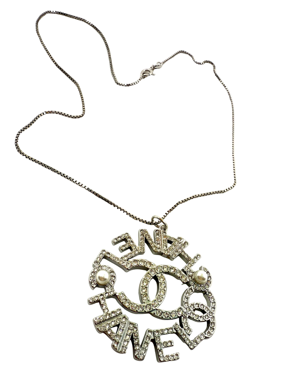 Sterling silver chain is 16” long. Repurposed charm is silver with intricate stone and pearl detail. Charm width is 1.6”.