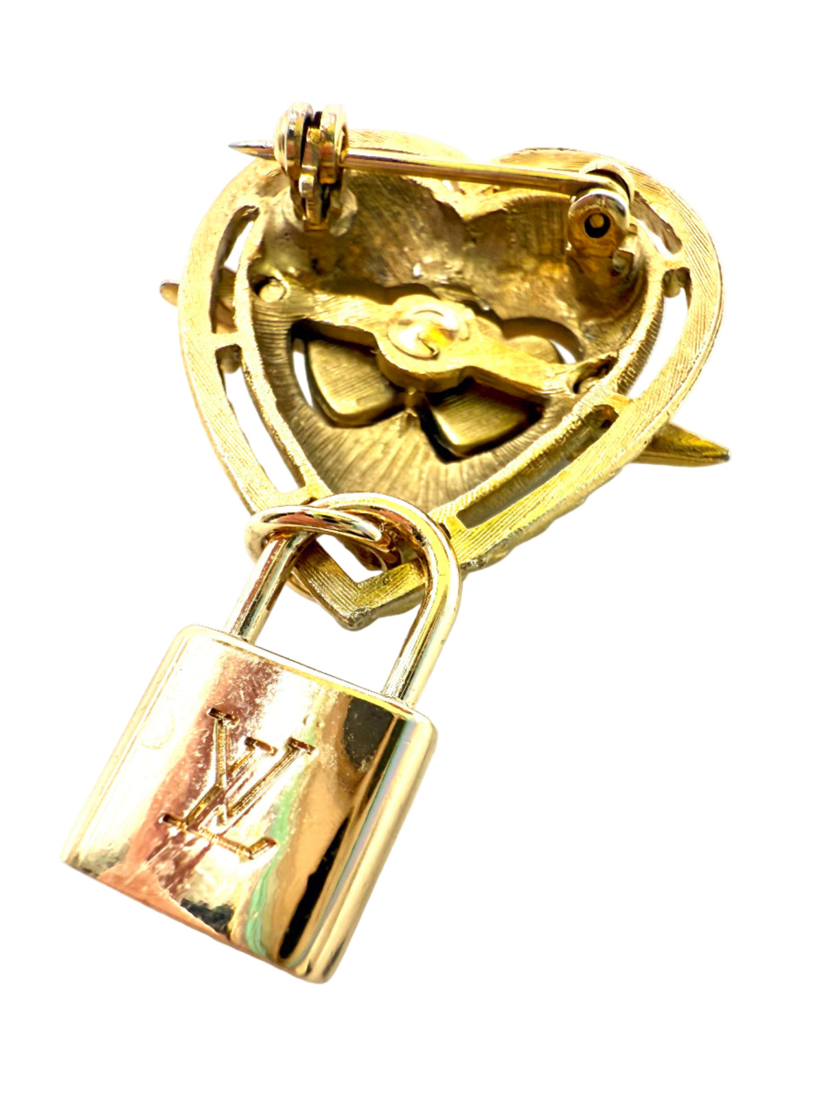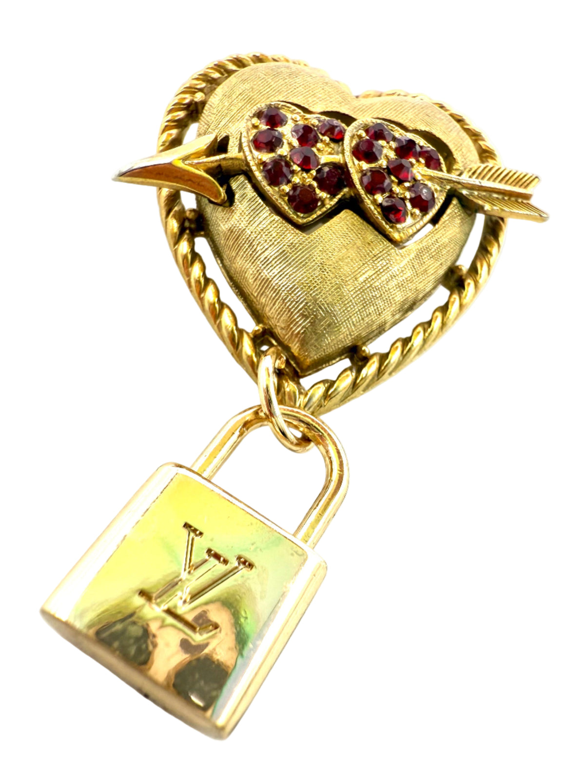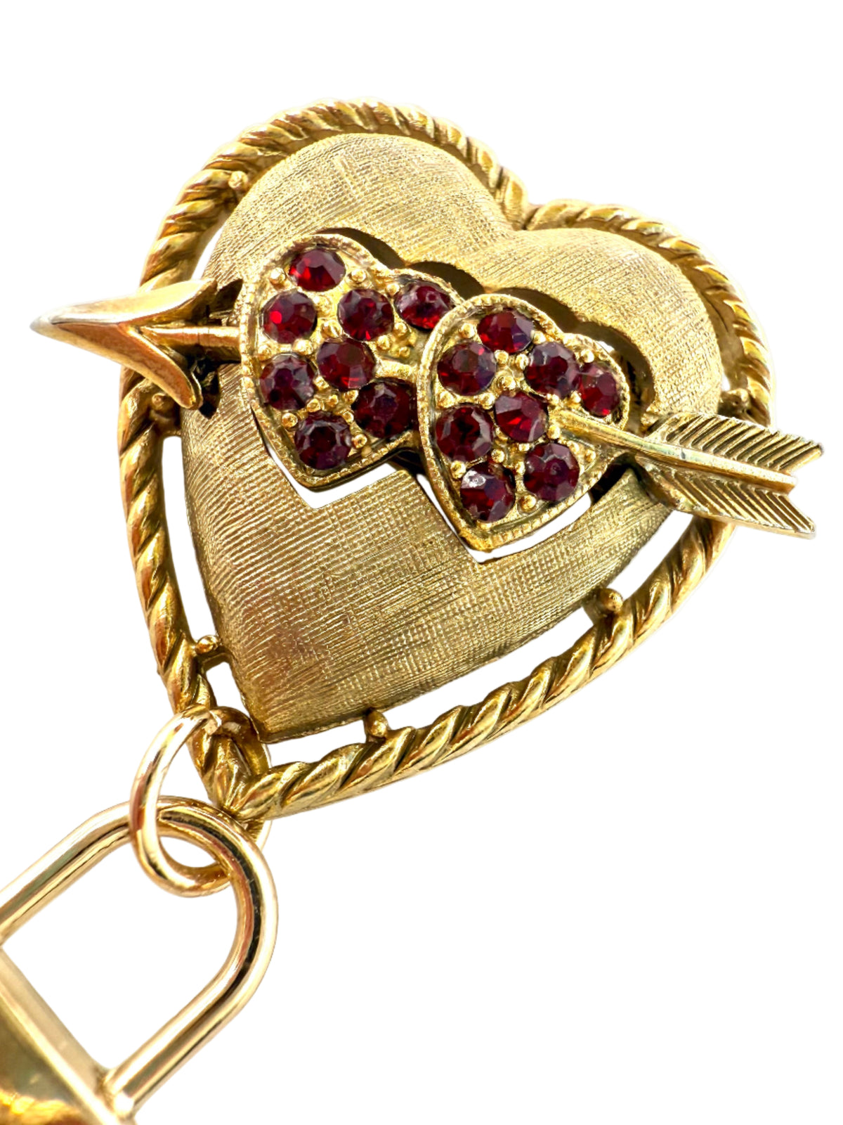 Brooch constructed from a repurposed vintage brooch with an added repurposed charm. Brooch is gold with red stone detail. Brooch width is 1.1" and length is 2.1".