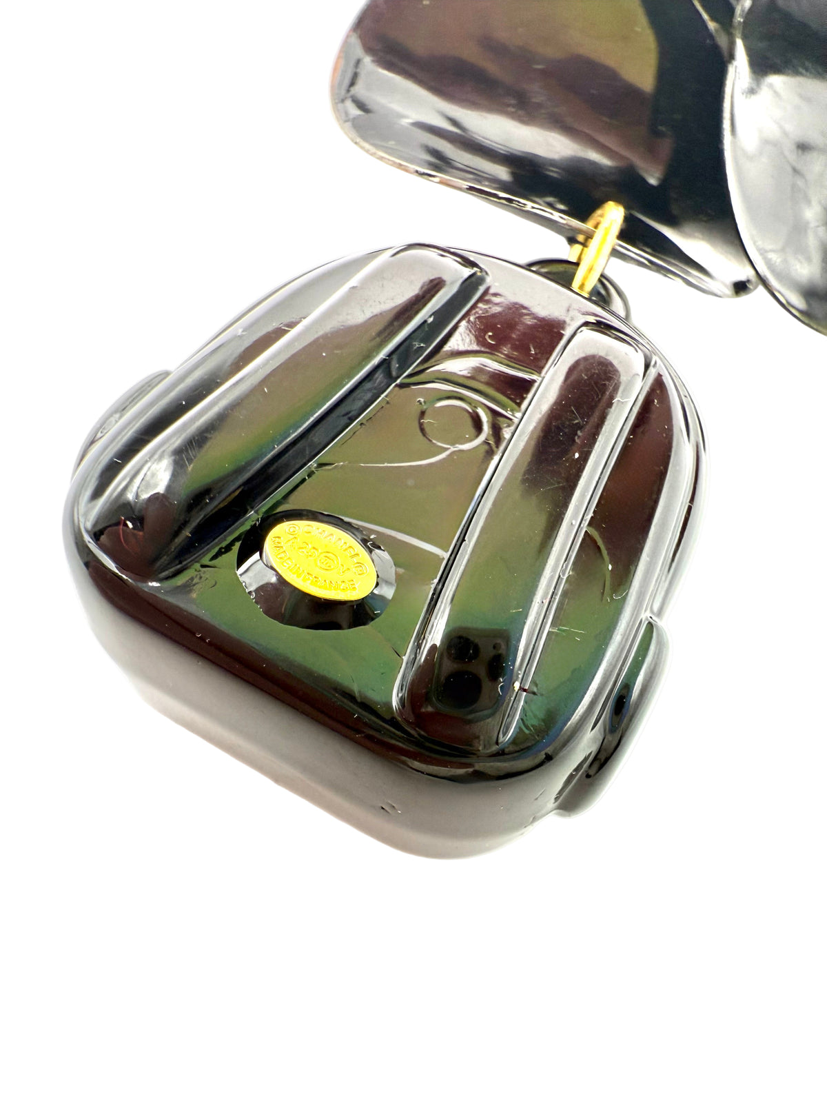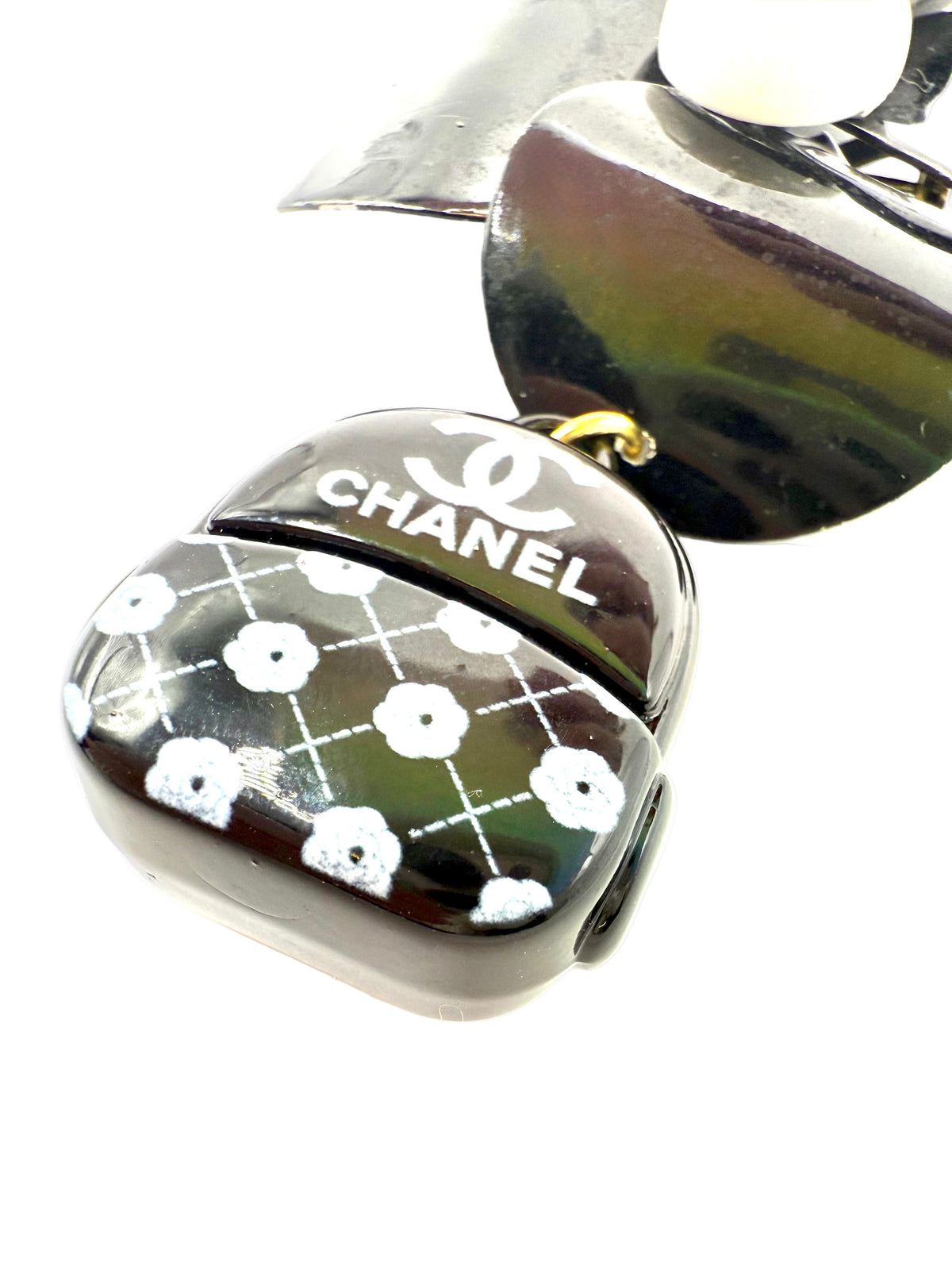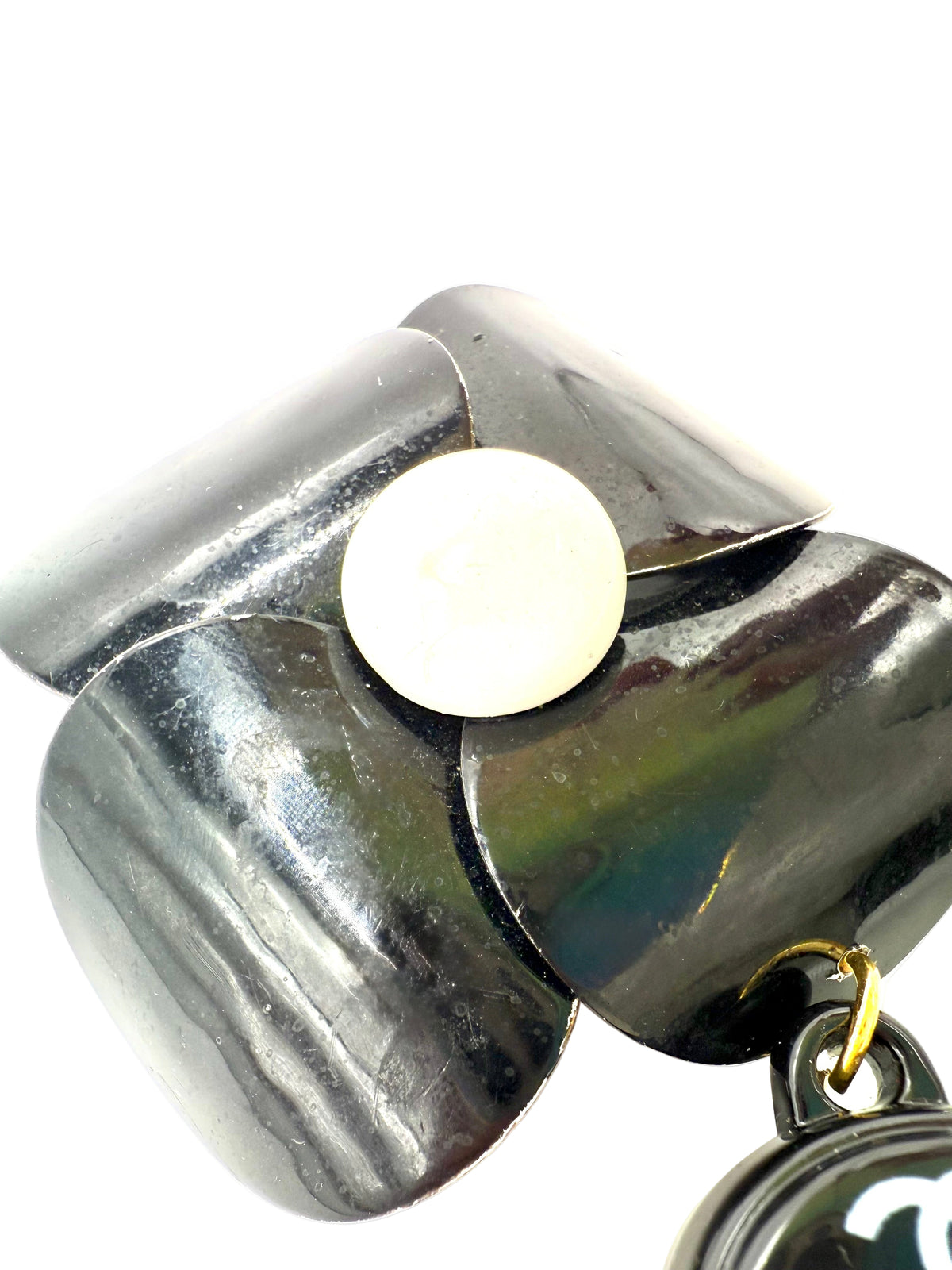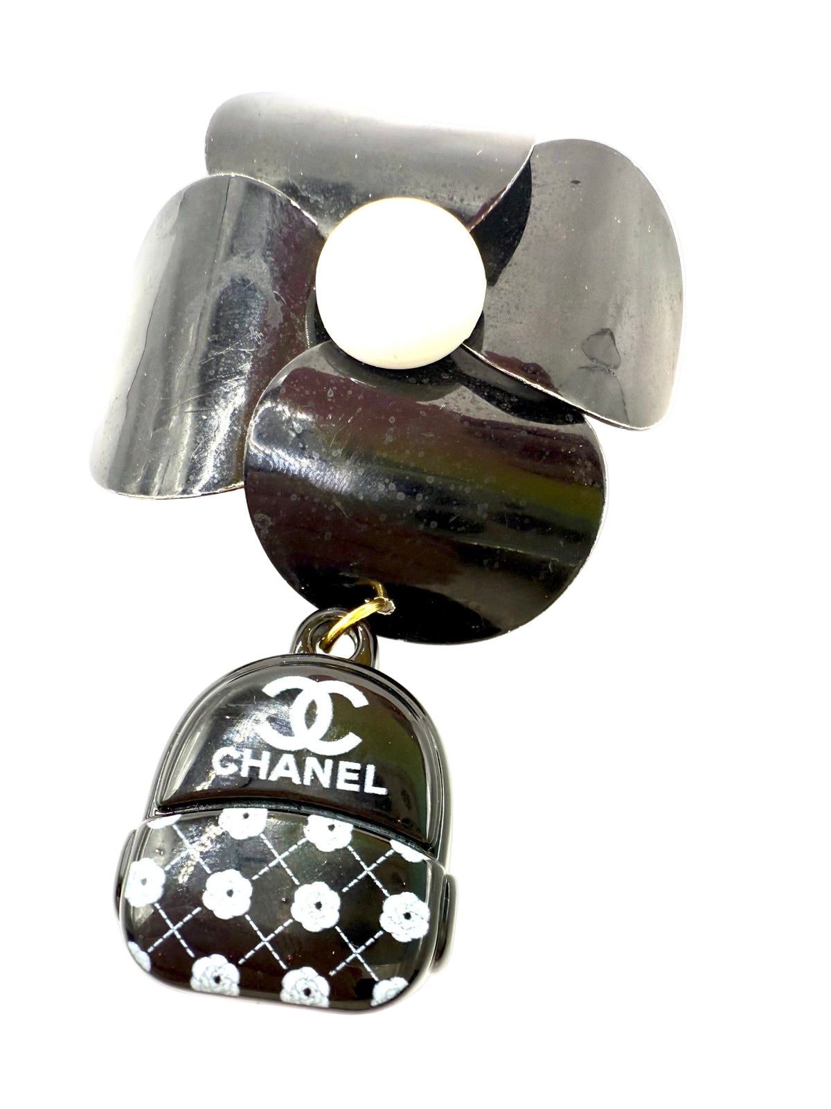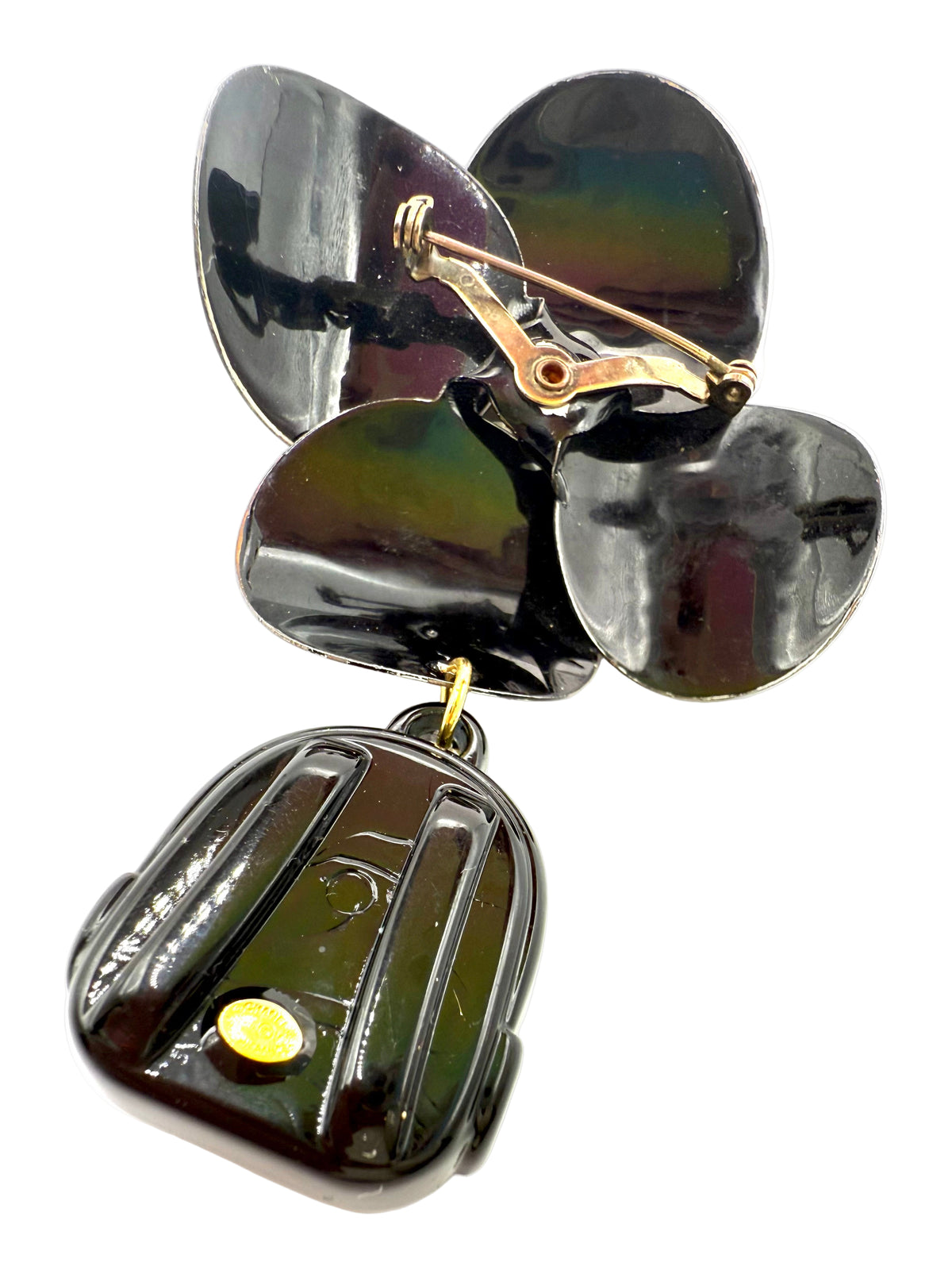 Brooch constructed from a repurposed vintage brooch with an added repurposed charm. Black and white brooch is 2.75" wide at widest portion and 4" long.