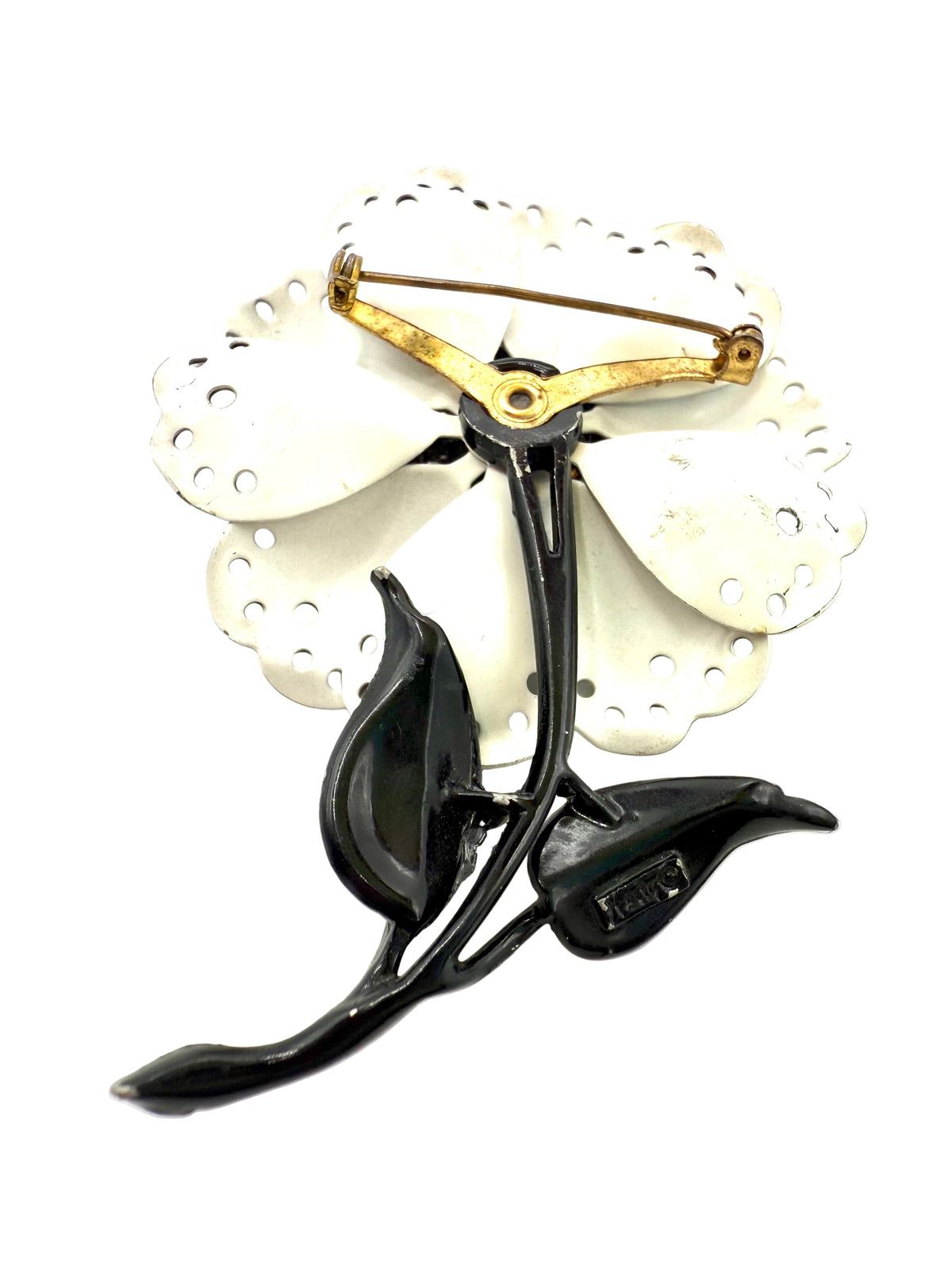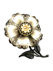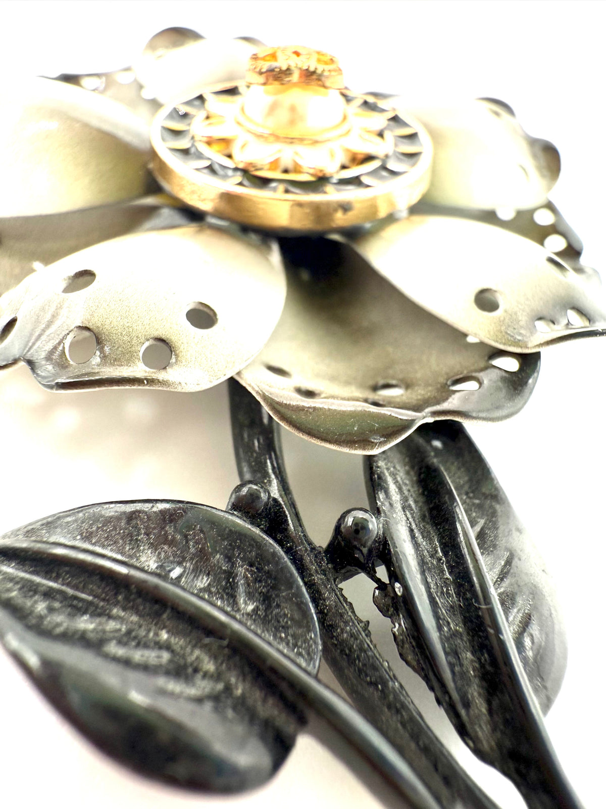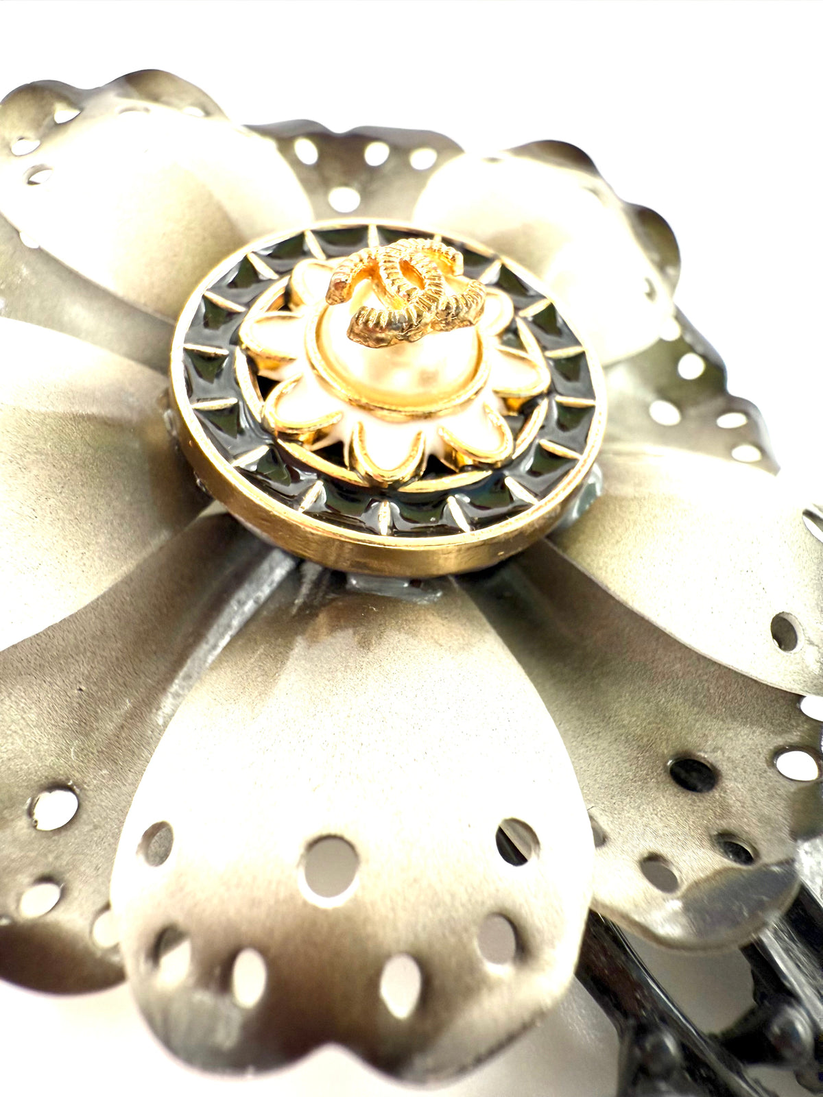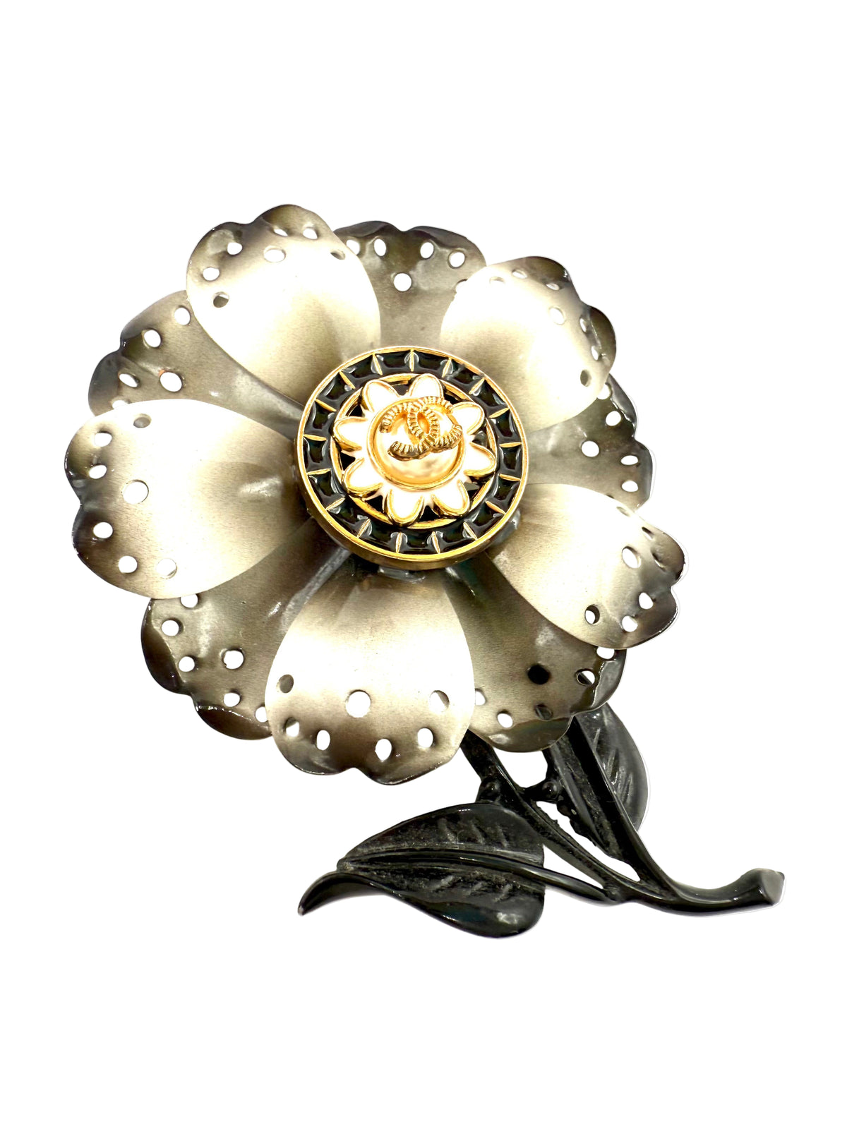 Brooch created from vintage brooch with added repurposed button center. Brooch is a tonal mix of black, gray and white. Button center is black and white with gold trim. Brooch is 2.25" wide and 3.5" long.