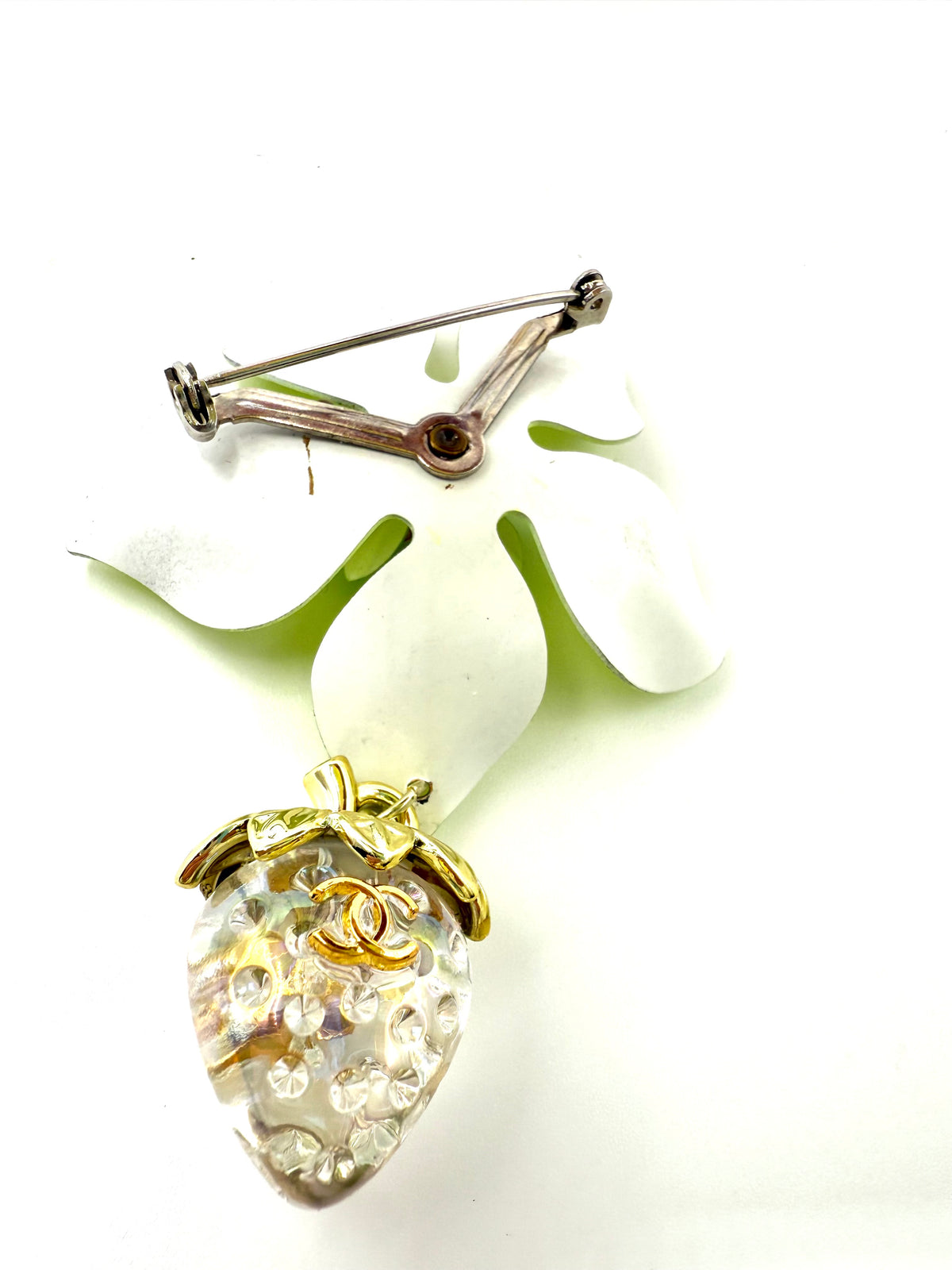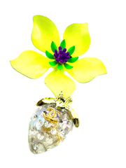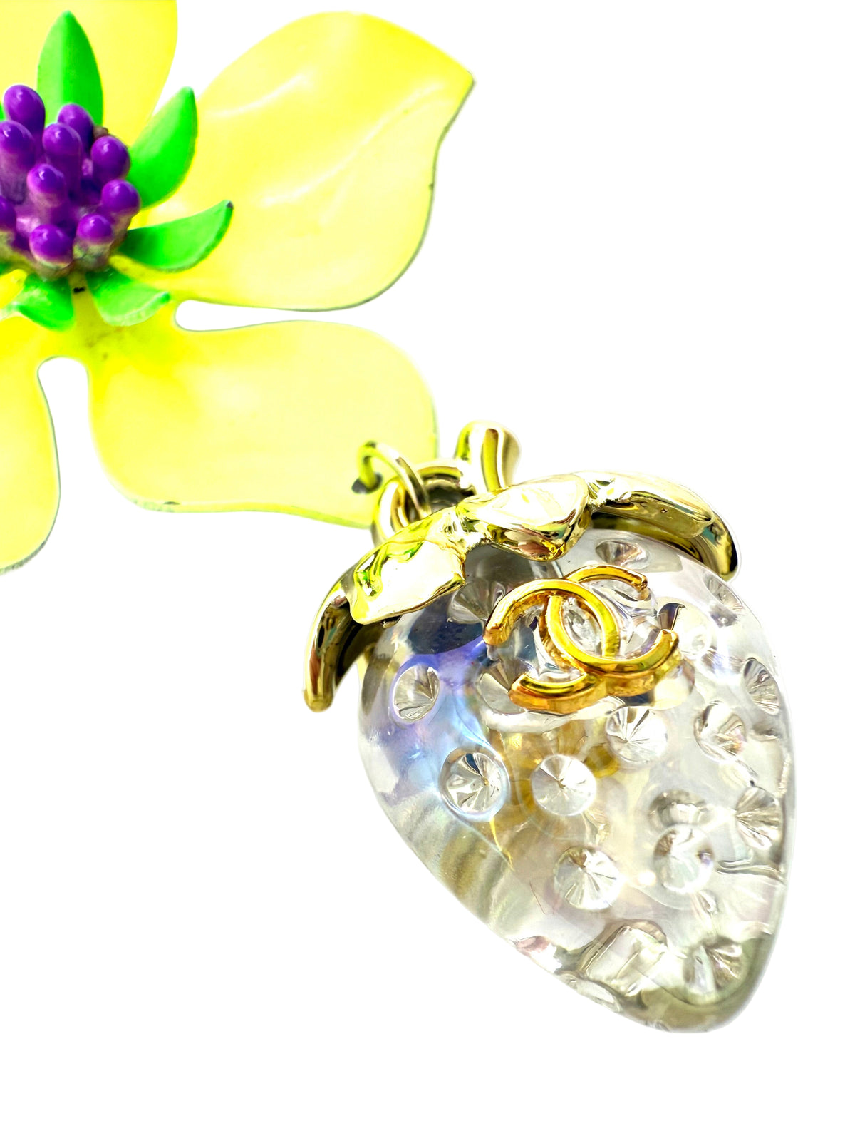 Brooch created from vintage brooch with added repurposed charm. Brooch is citrine yellow with lime green and purple center. Repurposed attached strawberry charm is clear with gold trim. Brooch is 2.25" wide and 3.5" long.