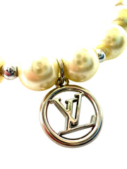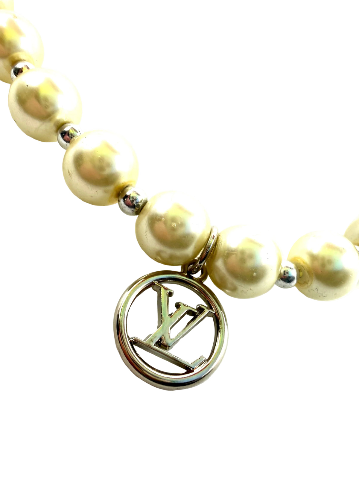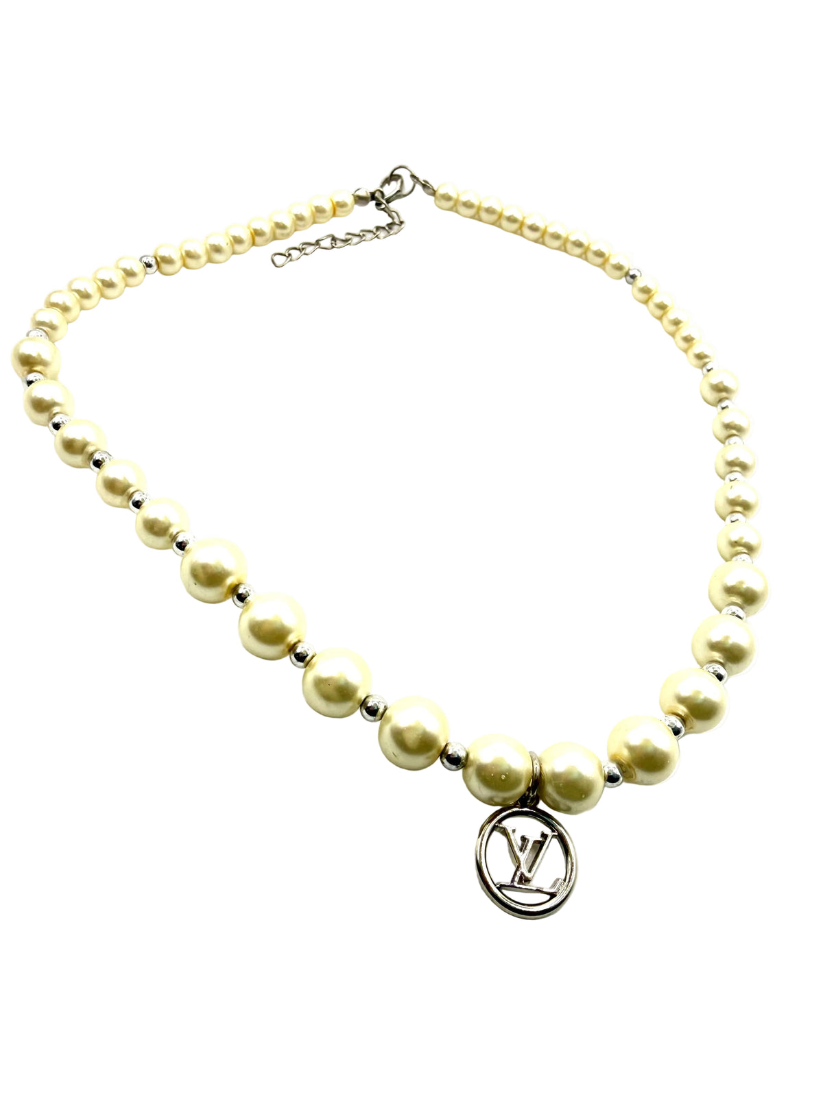 Necklace constructed from vintage costume jewelry necklace and repurposed charm. Necklace is faux pearl with silver bead detail. Necklace is 16” long with additional 2” expansion option. Repurposed silver charm is .5” wide.