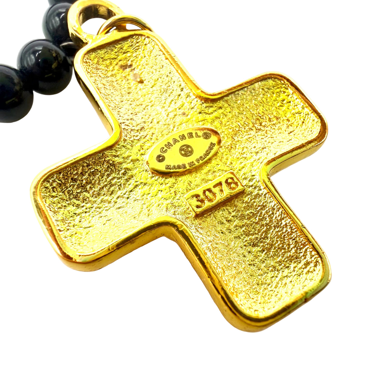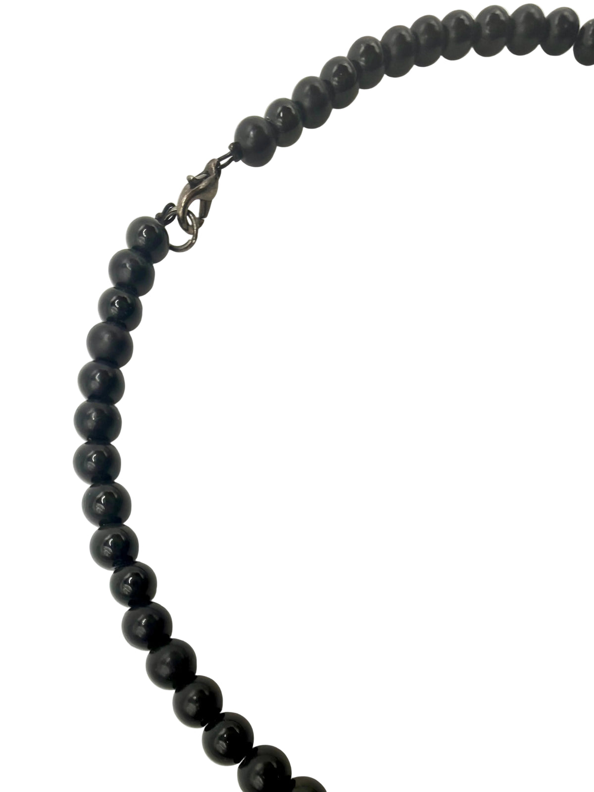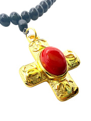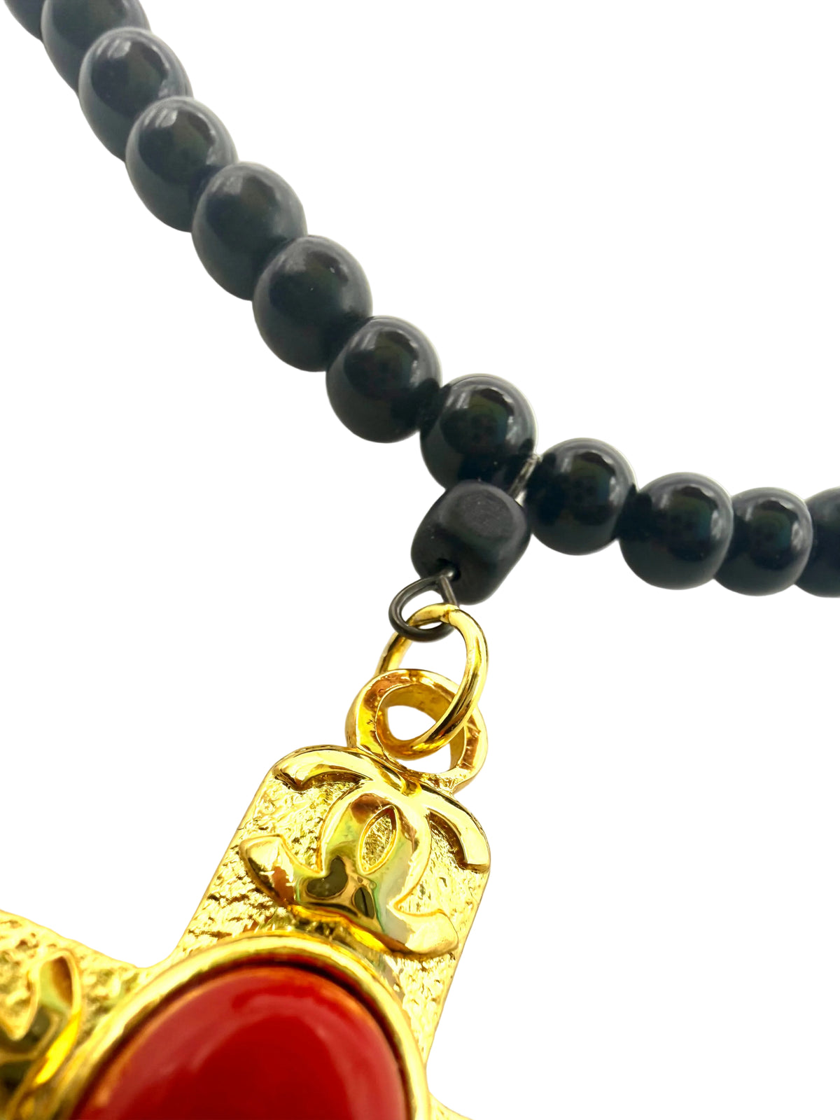 Necklace constructed from vintage costume jewelry necklace and repurposed charm. Black beaded necklace is 16” long. Repurposed charm is gold metal with red stone detail. Charm is 1.5” long and stamped on back.