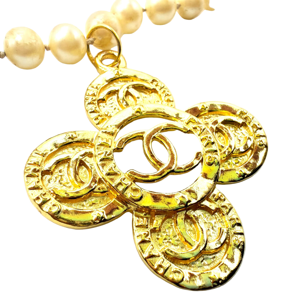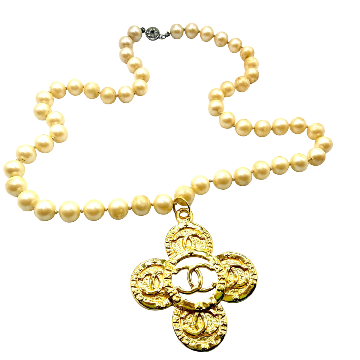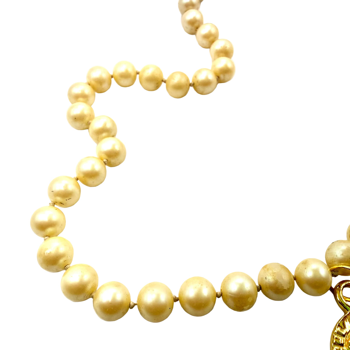 Necklace constructed from vintage costume jewelry necklace and repurposed charm. Double knotted faux pearl strand is 22” long. Repurposed gold metal charm is 2.25” long and 2” wide. Stamped on back,